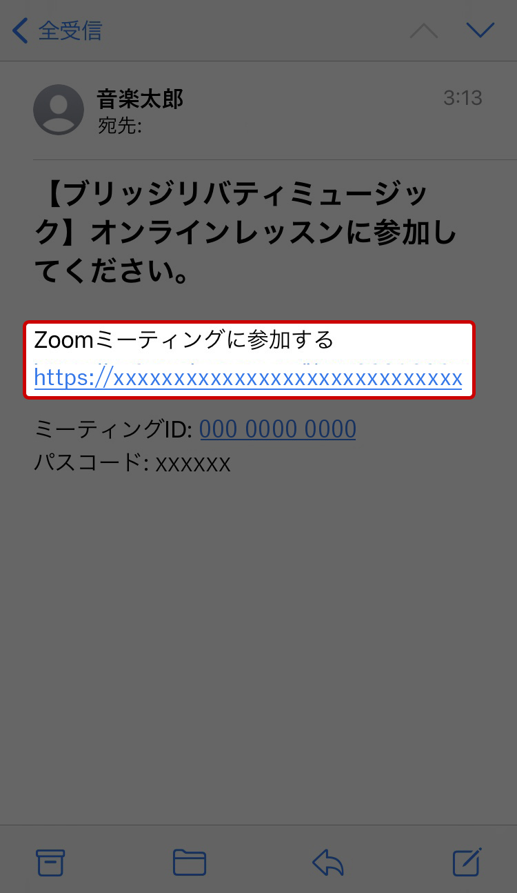 ① 定刻になりましたら、お申込み時にお送りいただいたメールアドレスへ「【ブリッジリバティミュージック】オンラインレッスンに参加してください。」という件名で、教室からzoomの招待をお送りします。